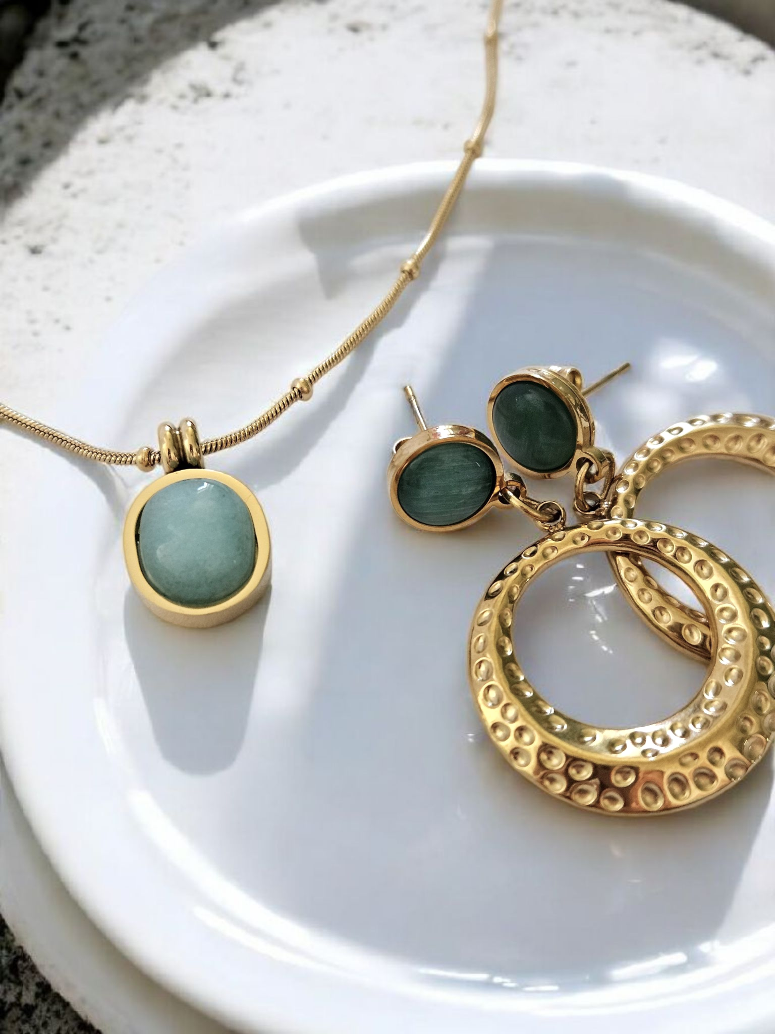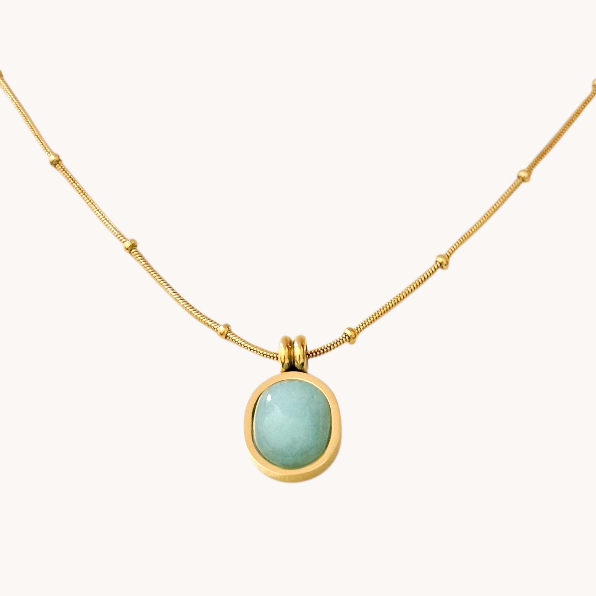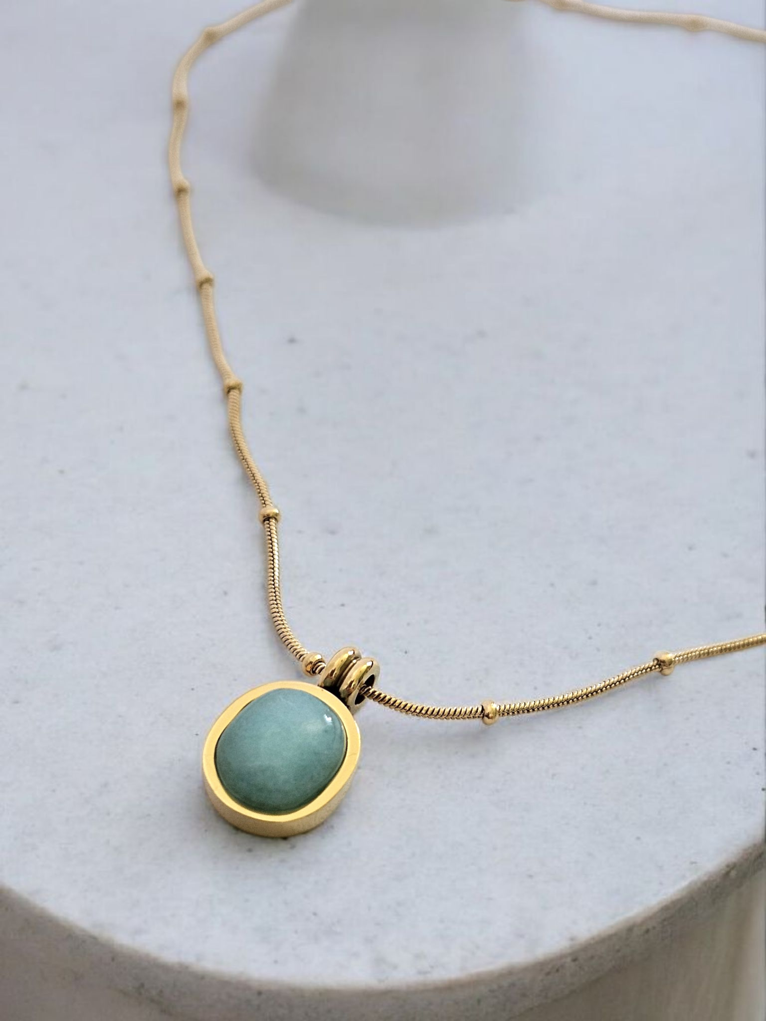 Our 18k Gold Plated Aria Necklace is a sleek balance of cool and classic. The soft green stone famed in polished gold makes a subtle statement - refined, modern and effortlessly versatile. Perfect for adding a touch of colour to everyday looks or elevating a night-out fit.
