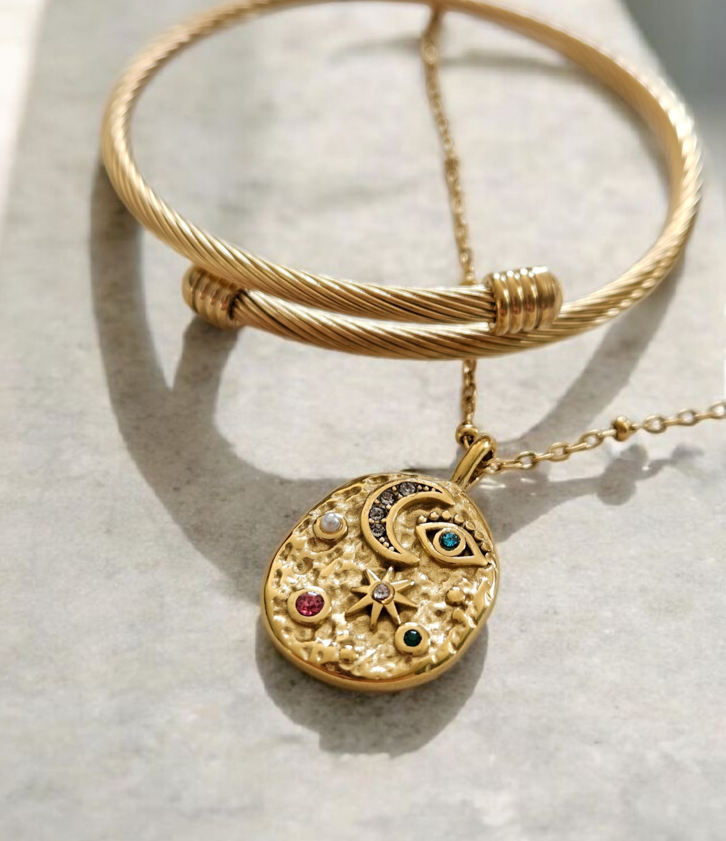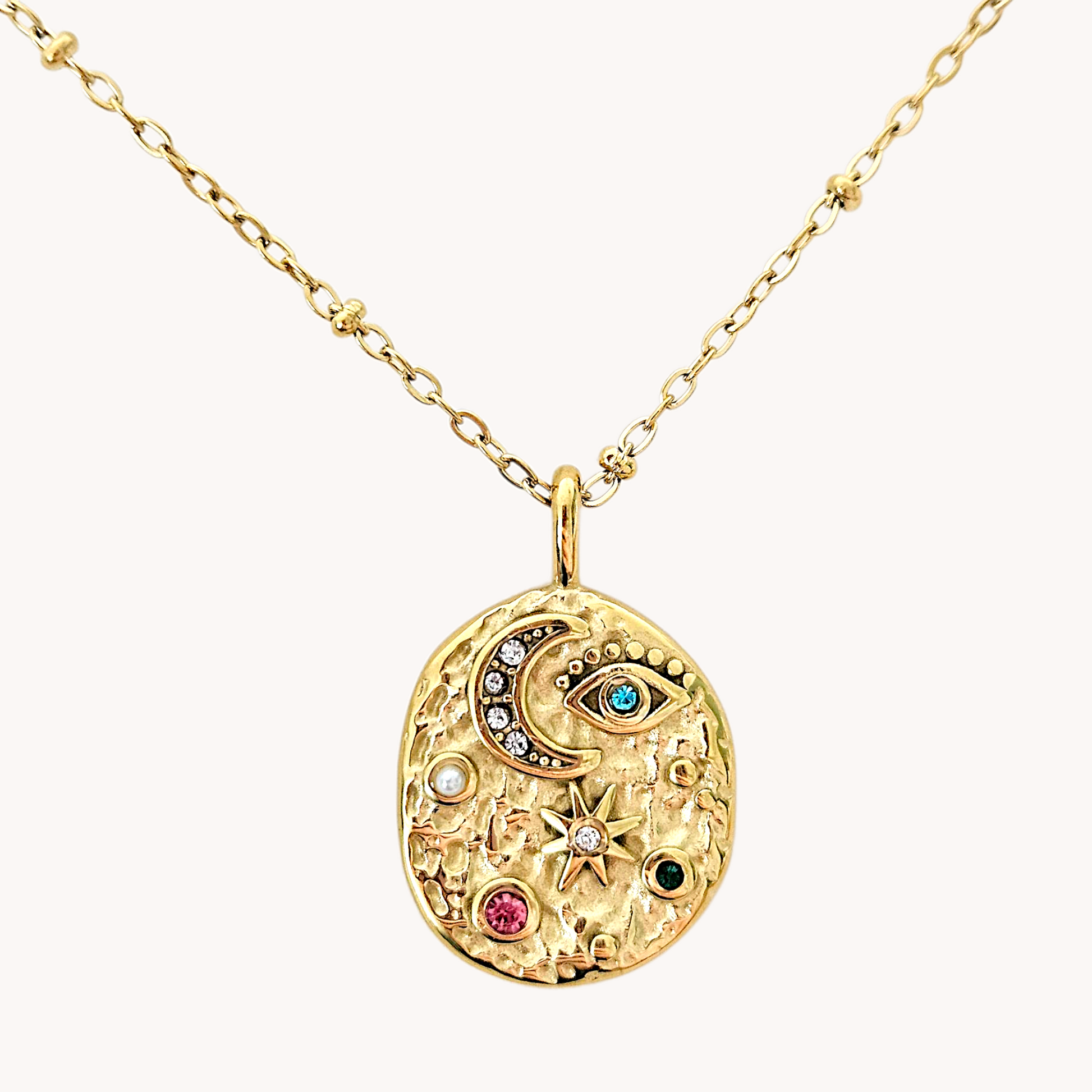 Our 18k Gold plated Astra Necklace is like a little universe you can wear around your neck. A warm gold pendant etched with moon, stars and cosmic symbols, accented with colourful stones that catch the light just right. Wear it when you're manifesting, mood-boarding or just wanting to add a little stardust to your outfit.