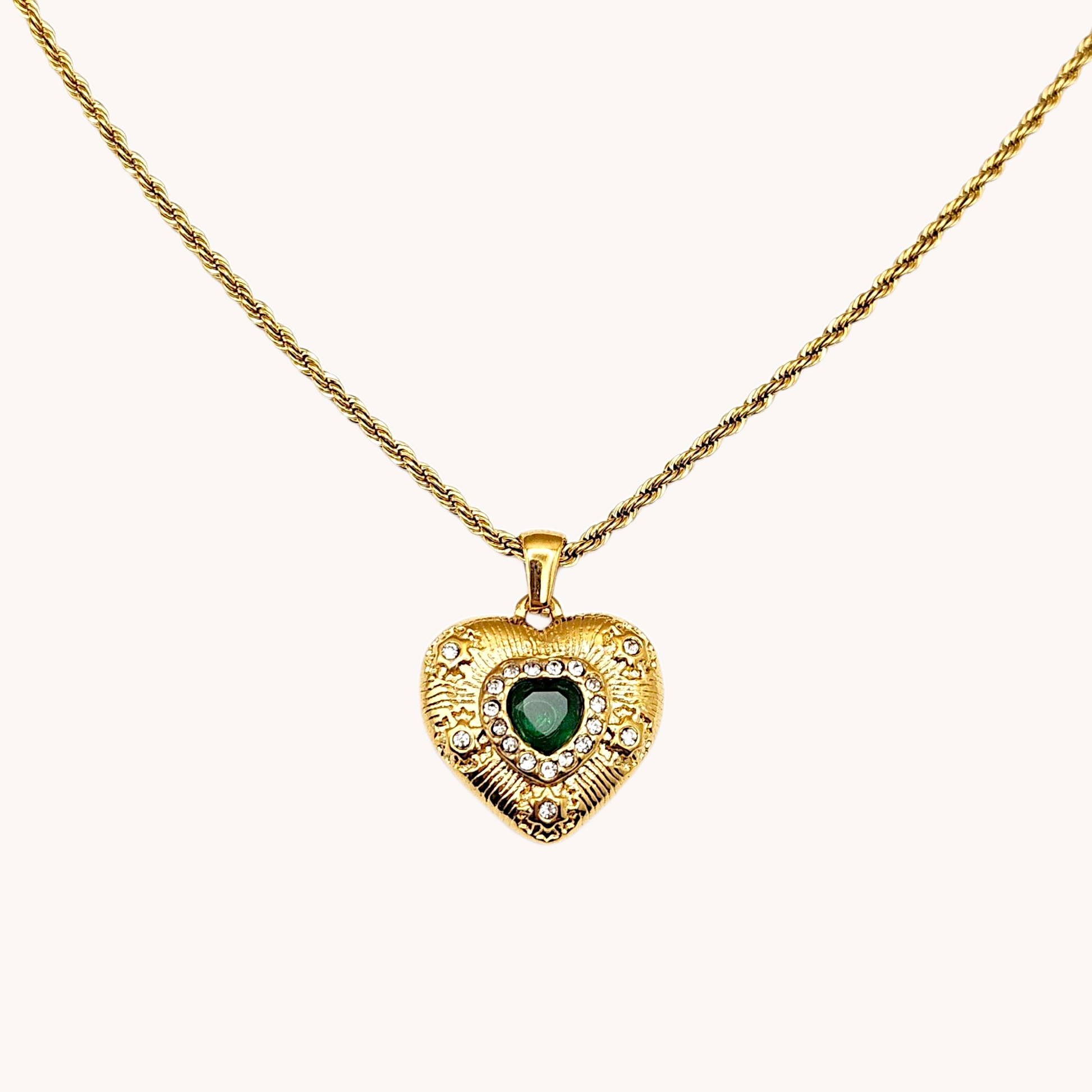 Our Dora 18k gold plated necklace has a bold, slightly nostalgic feel. The heart-shaped pendant features a textured surface, framed with small clear stones, and a deep green gem right in the centre. It’s got that mix of statement and sentimentality, the sort of piece that makes even a plain outfit feel more intentional.