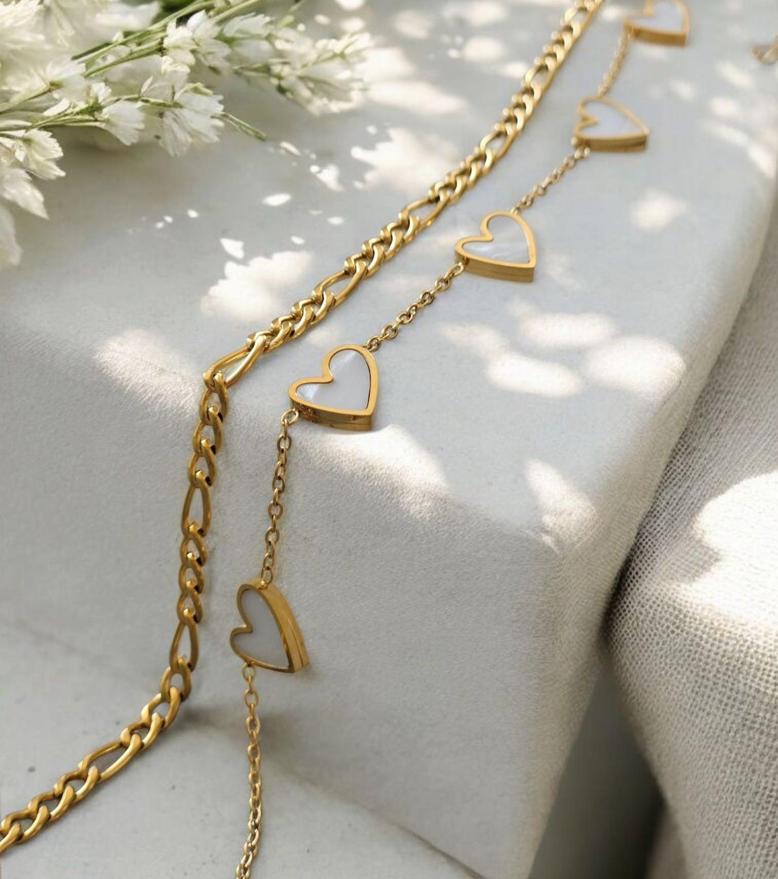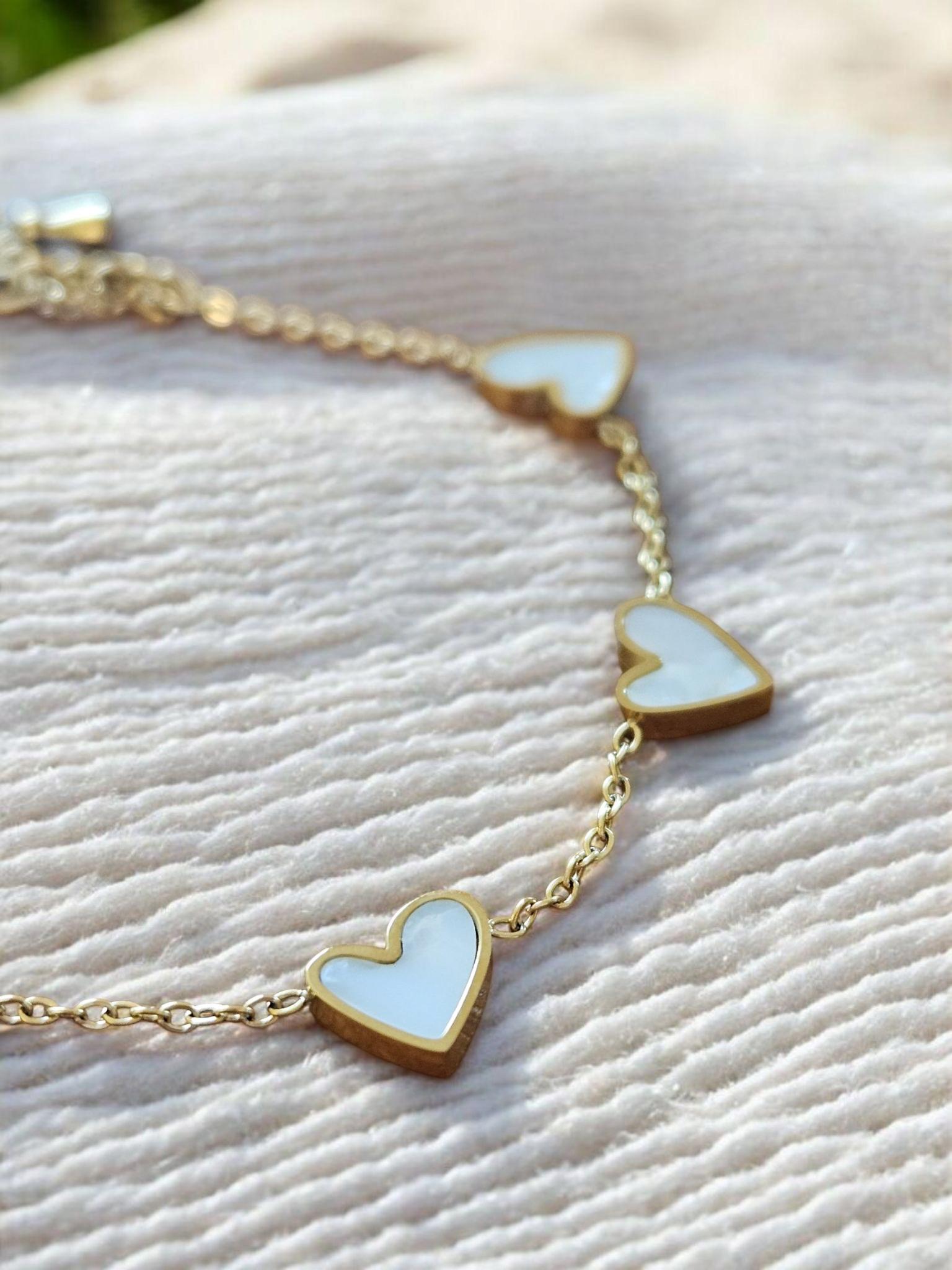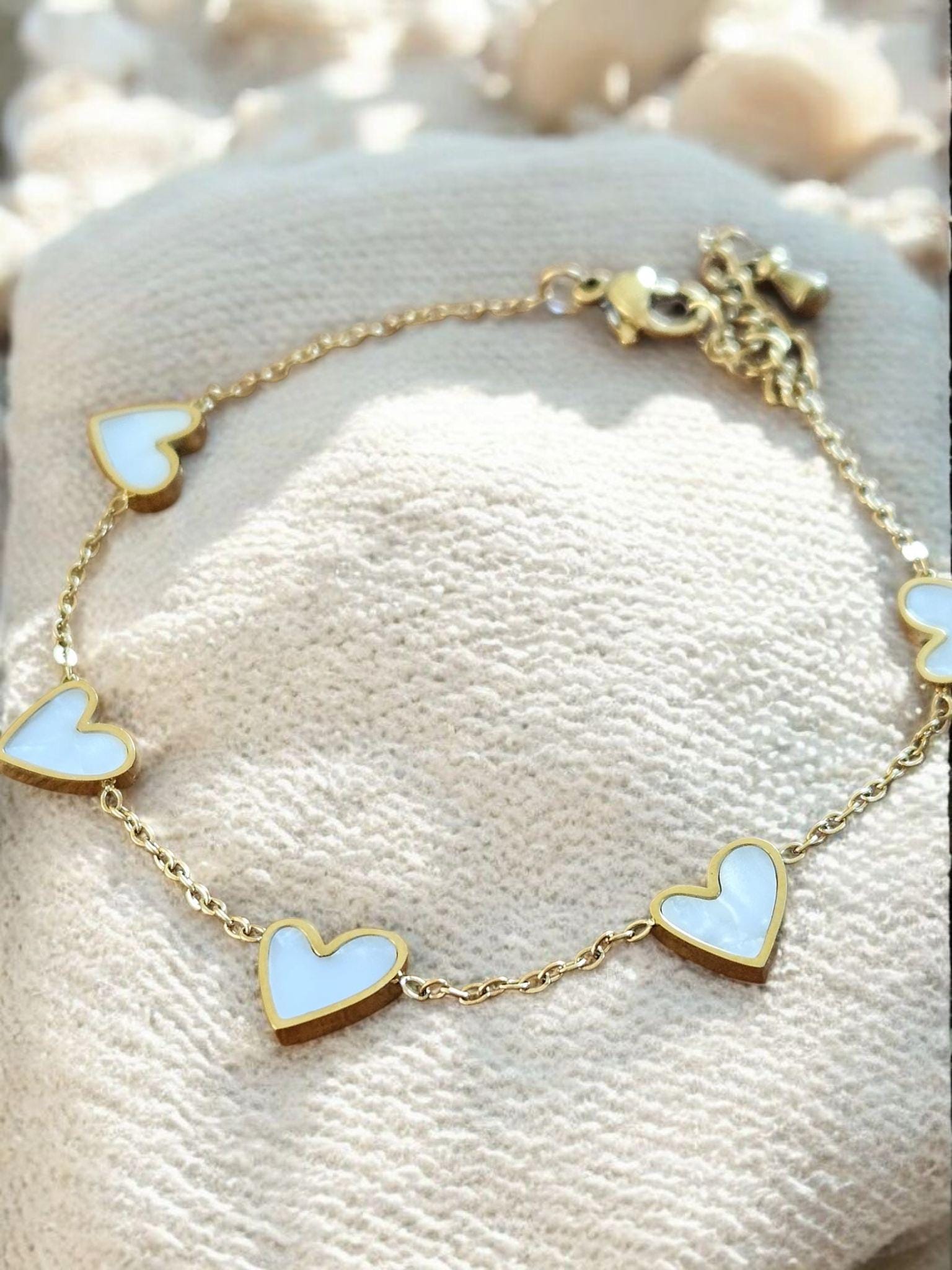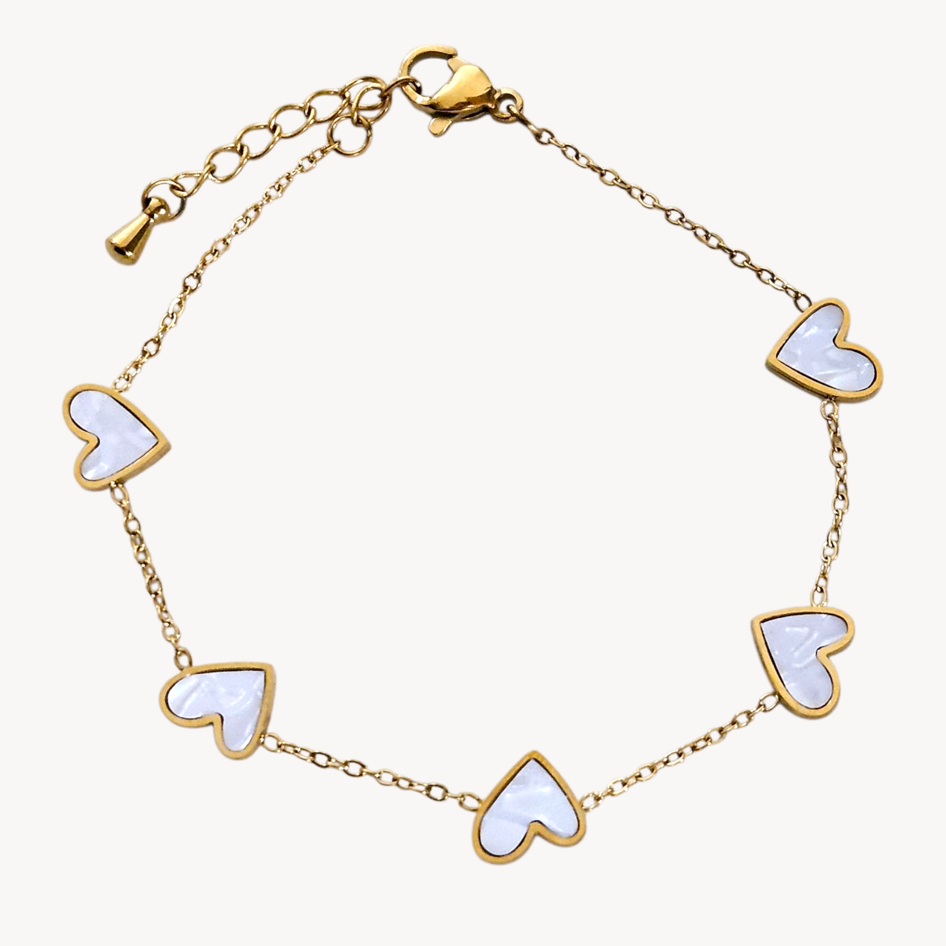 Sweet, subtle and versatile. Our Esme gold chain bracelet is dotted with white shell hearts, giving it a soft, romantic vibe that pairs perfectly with everything.