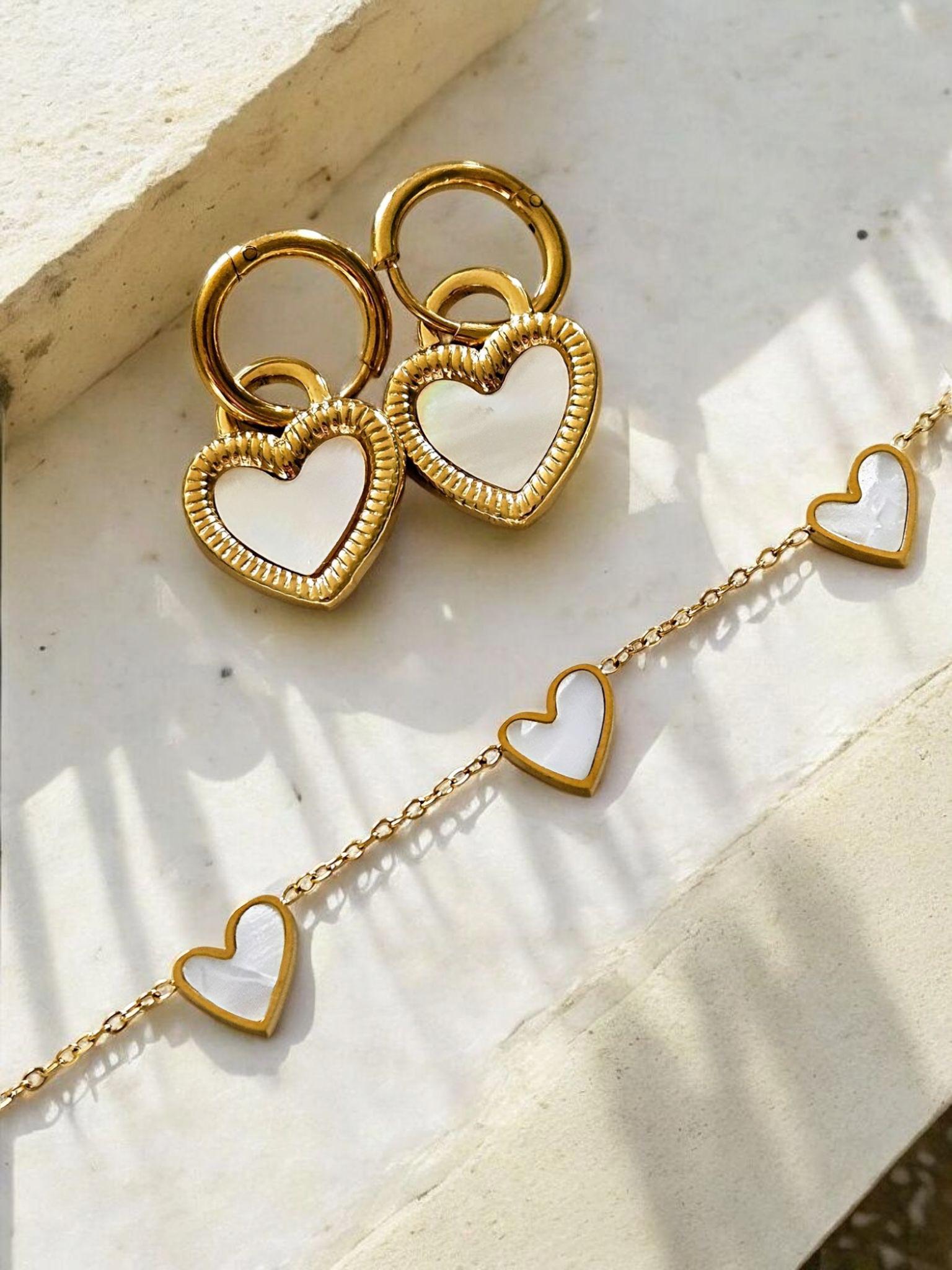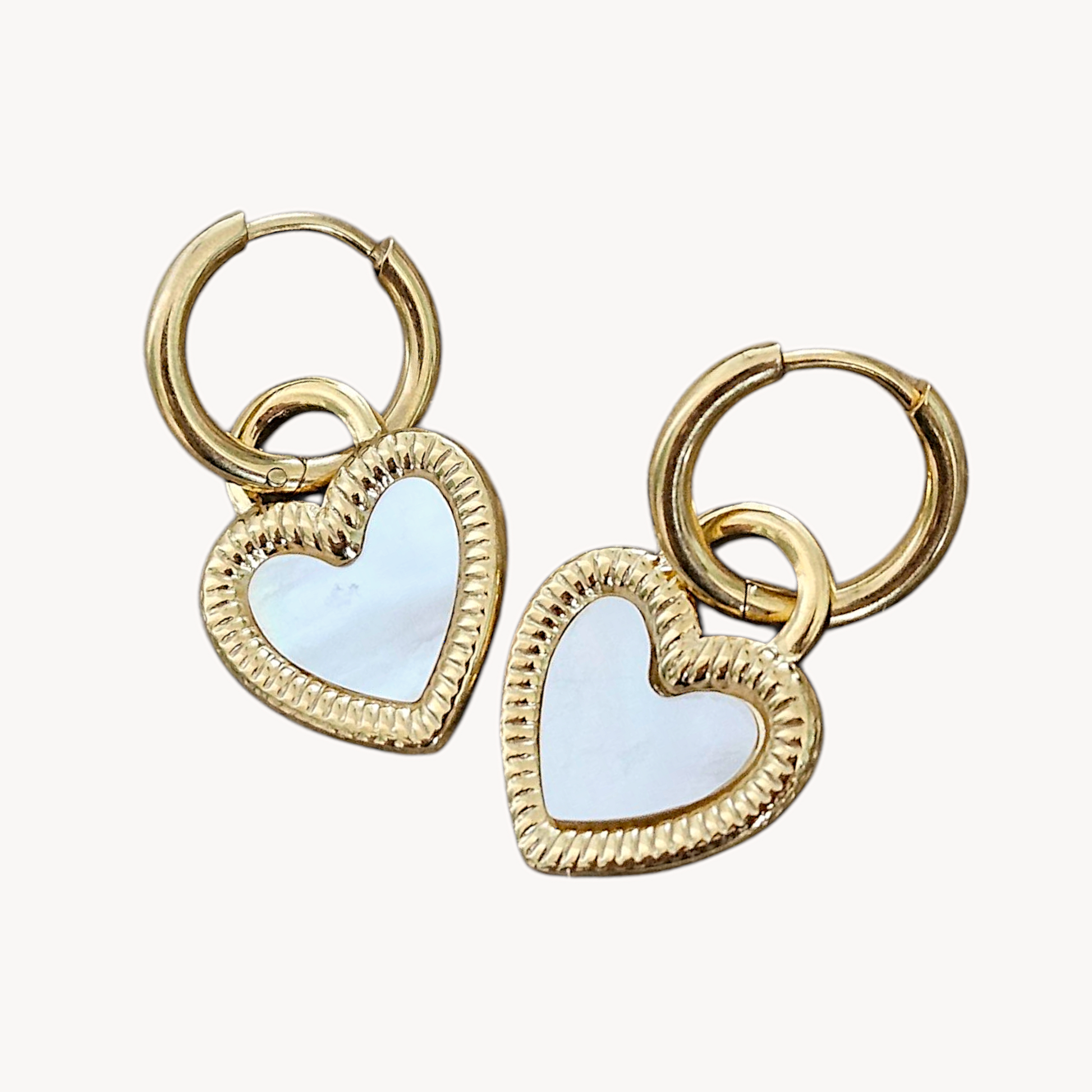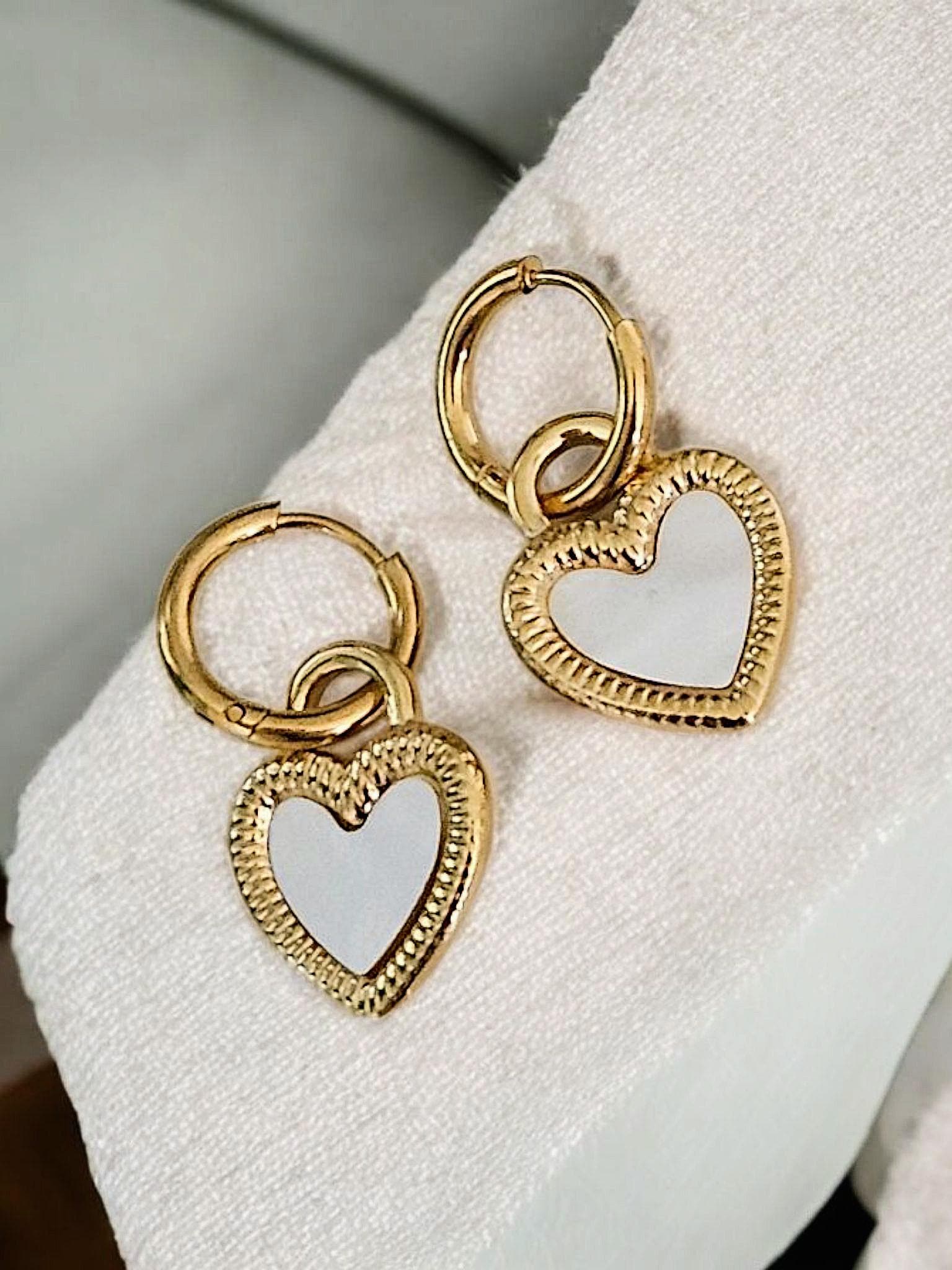 Love is in the air with our Esme earrings. Our gold hoop earrings feature these gorgeous white and gold hearts and are perfect for any outfit.
