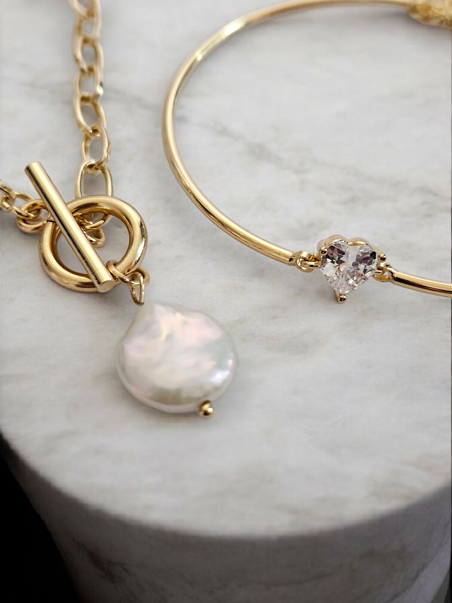Our 18k Gold plated Harriet necklace is your new go to statement piece. A chunky gold chain with a modern edge, the toggle clasp and fresh water pearl design makes this a necklace which is guaranteed to get compliments.