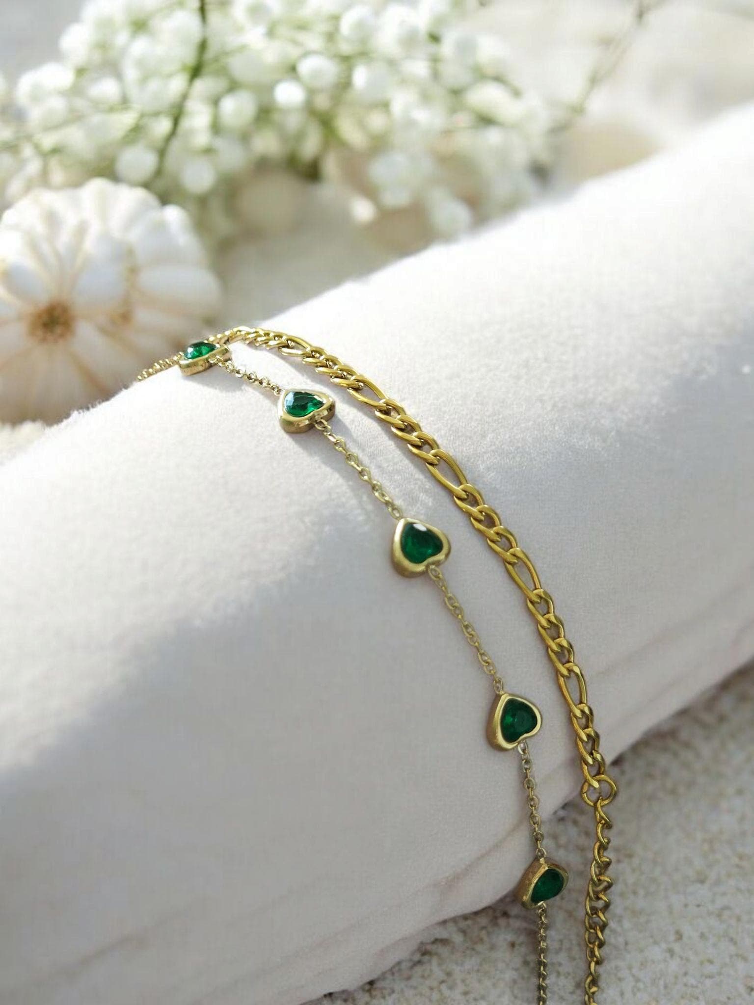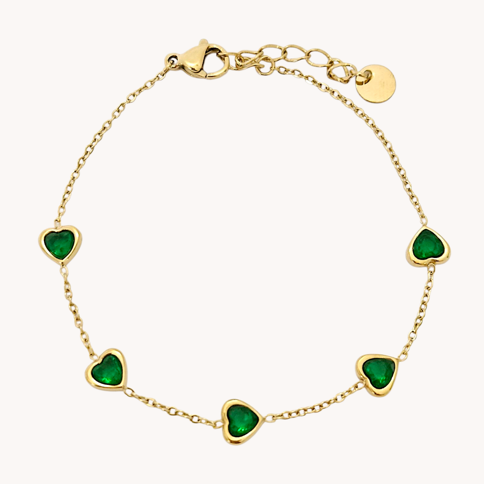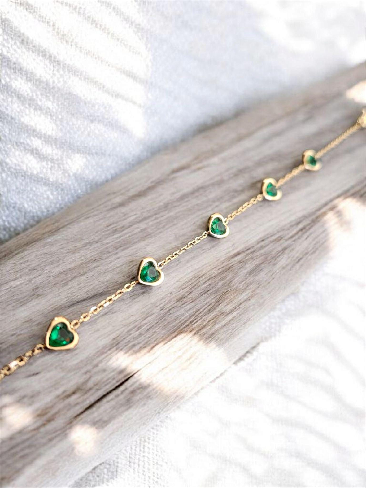 Our Jade Emerald Heart Chain Bracelet is the perfect mix of cute and classy. Five dainty green heart charms linked by a delicate gold chain. If 'effortless chic' was a bracelet, this would be it!