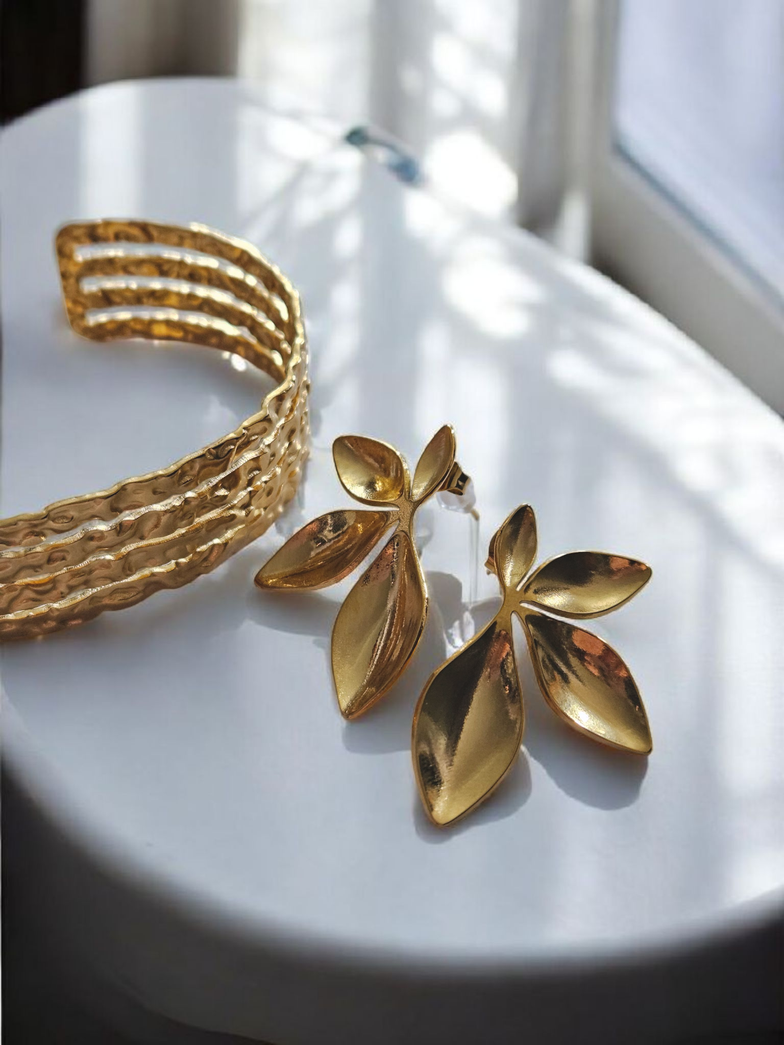 Our Gold Monica Bangle is the ideal bangle for a day at a beach club, or a fancy evening meal. With its textured design this bangle catches the light just right and is going to elevate any look.
