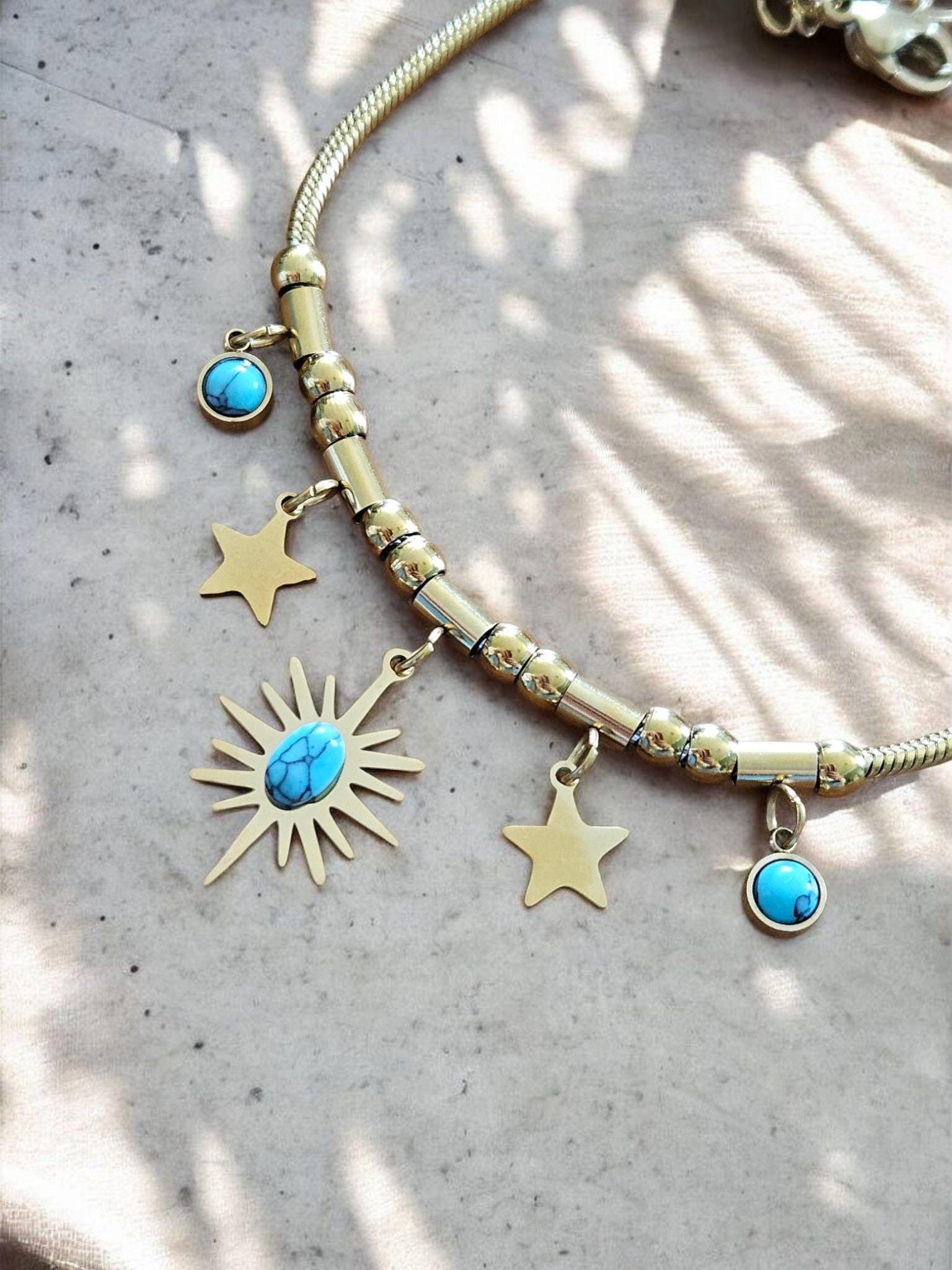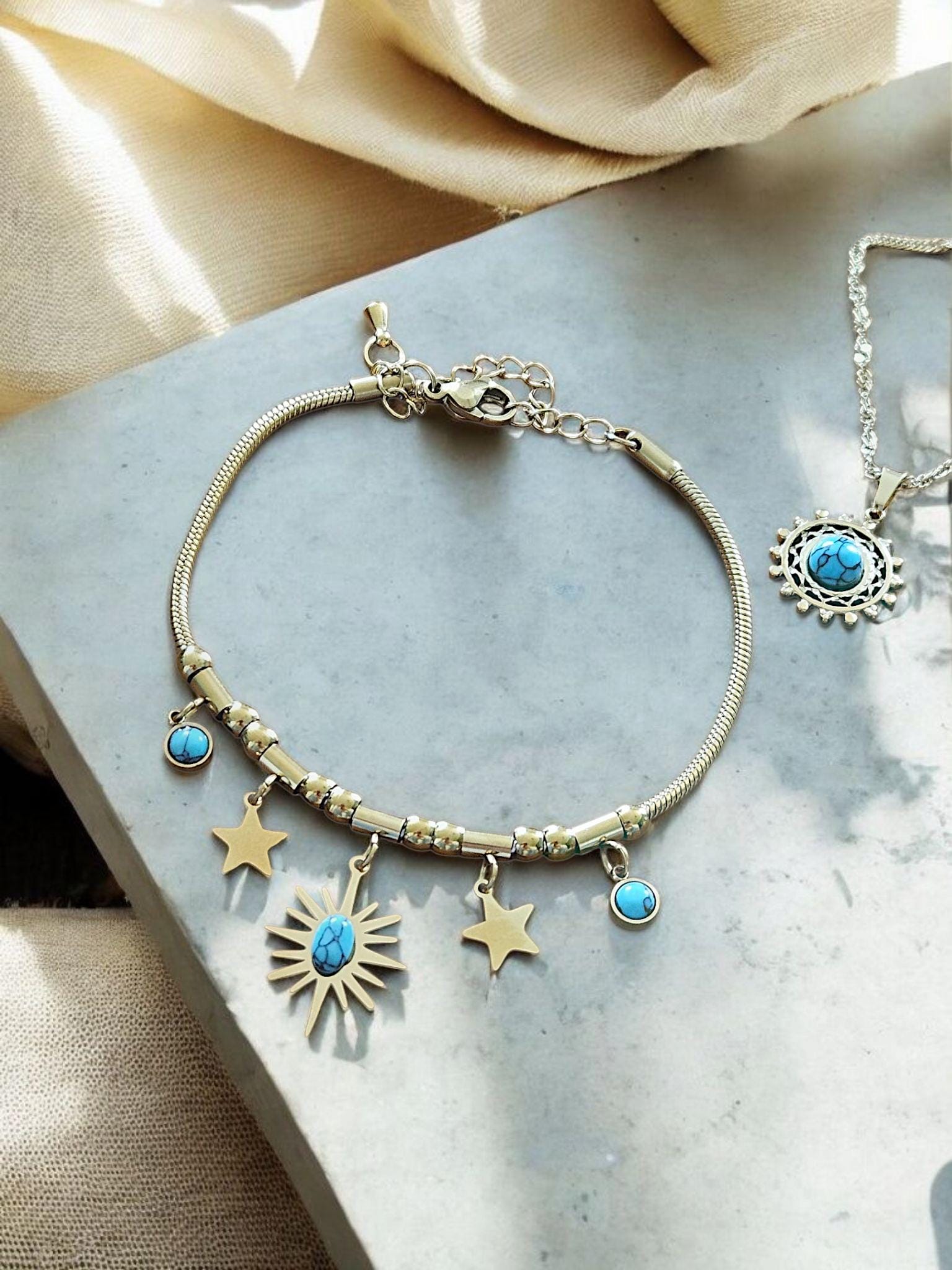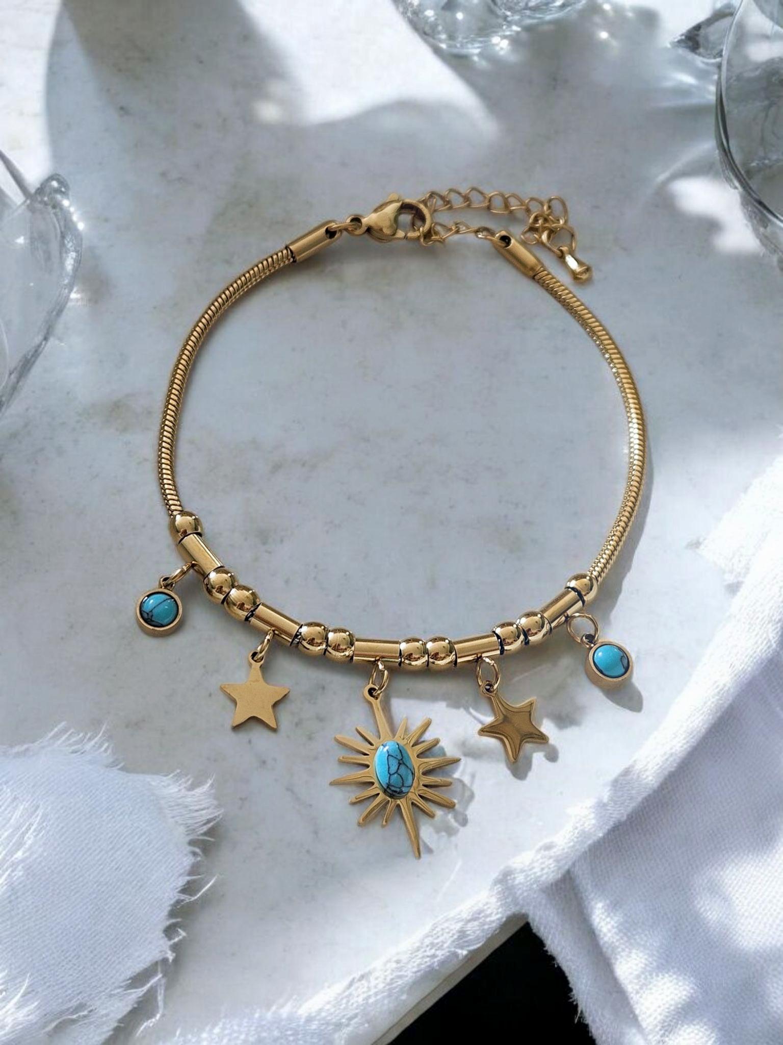 Our 18k gold-plated Olivia bracelet features dreamy star and sun motifs with delicate turquoise accents. Minimal, magical and made to layer or stand alone.