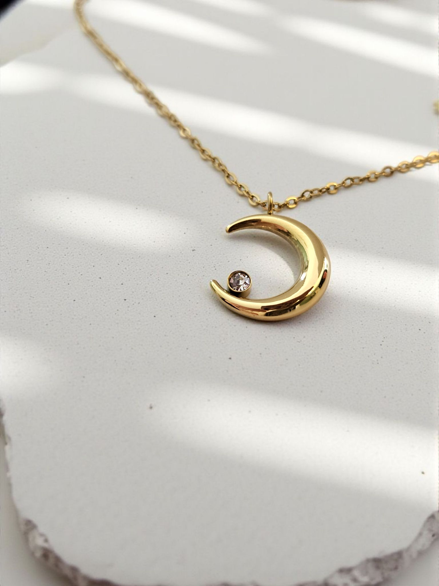 Our 14k gold plated Orla necklace features a fine chain with a crescent moon pendant and a tiny stone nestled at its curve. It’s the sort of piece that looks effortlessly put-together, subtle but with just enough detail to make it feel thoughtful.